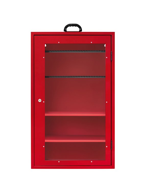 Estação de Bloqueio confeccionada em aço carbono de 1,0mm e alça plástica anatômica articulável. A parte frontal é composta por chapa de acrílico de 2,0mm que permite a visualização interna dos itens. A peça recebe tratamento de fosfatização e posterior pintura eletrostática na cor vermelho. Contém 50 posições de suporte, 2 ficheiros e 2 prateleiras de sustentação.