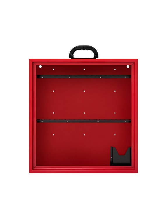 Estação Mista de Bloqueio confeccionada em aço carbono de 1,0mm e alça plástica anatômica articulável. A peça recebe tratamento de fosfatização e posterior pintura eletrostática na cor vermelho. Contém 36 posições de suporte, sem porta e 1 ficheiro. Disponível nos modelos aberto e com porta em acrílico que, por sua vez, permite que o acesso seja restrito à apenas profissionais capacitados e designados para execução das atividades, uma vez que conta com sistema de fechadura.
